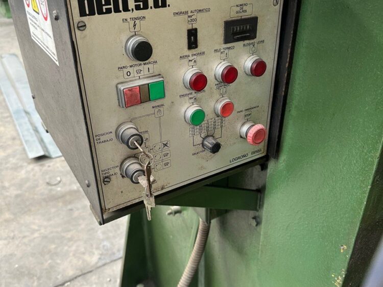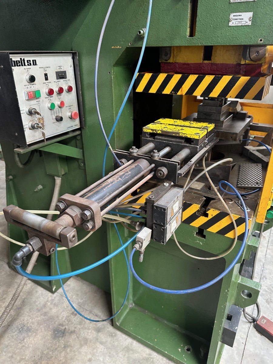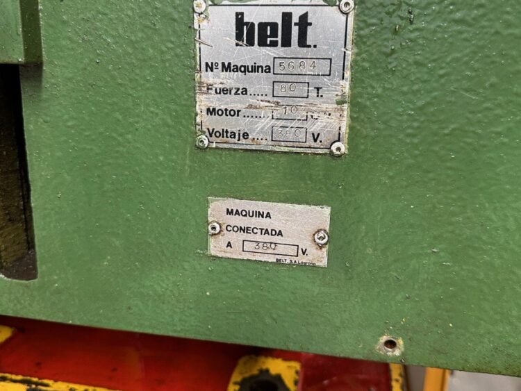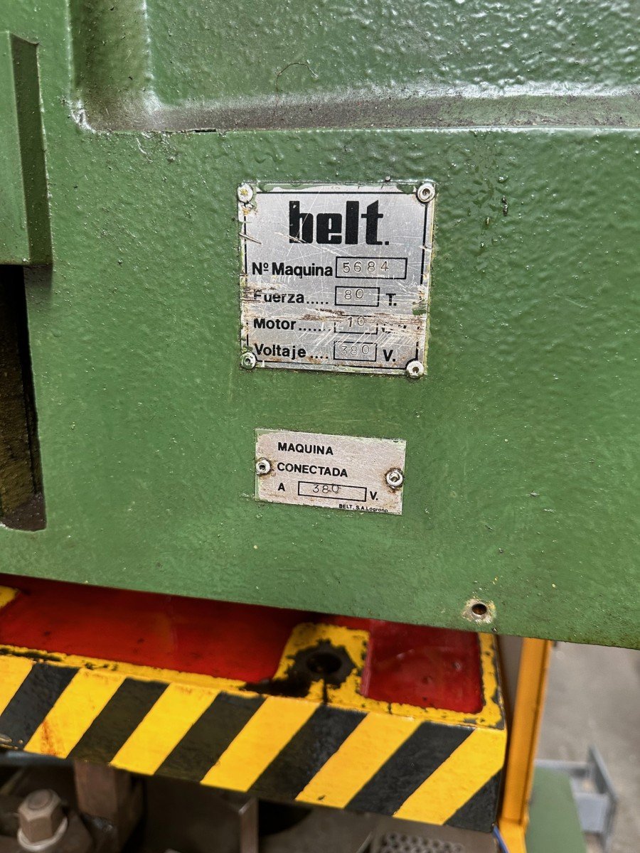 BELT 80-ton eccentric press with pneumatic clutch, parts feeder, 1000 × 570 mm table and 10 HP motor. 7000 kg. Good condition.