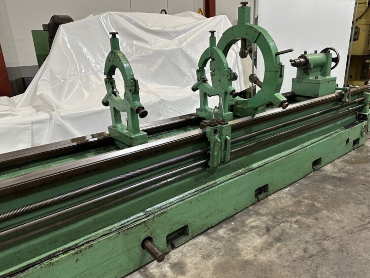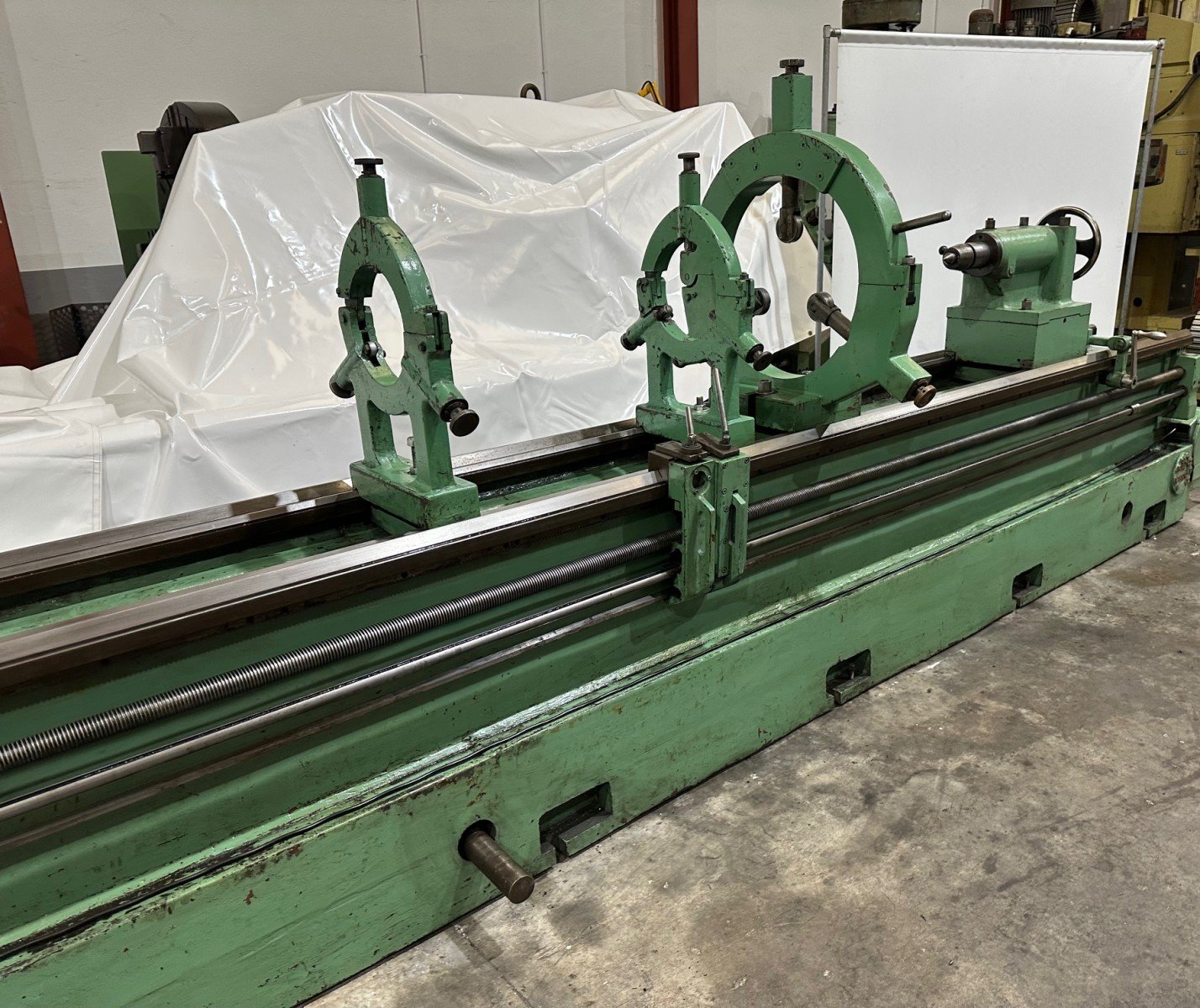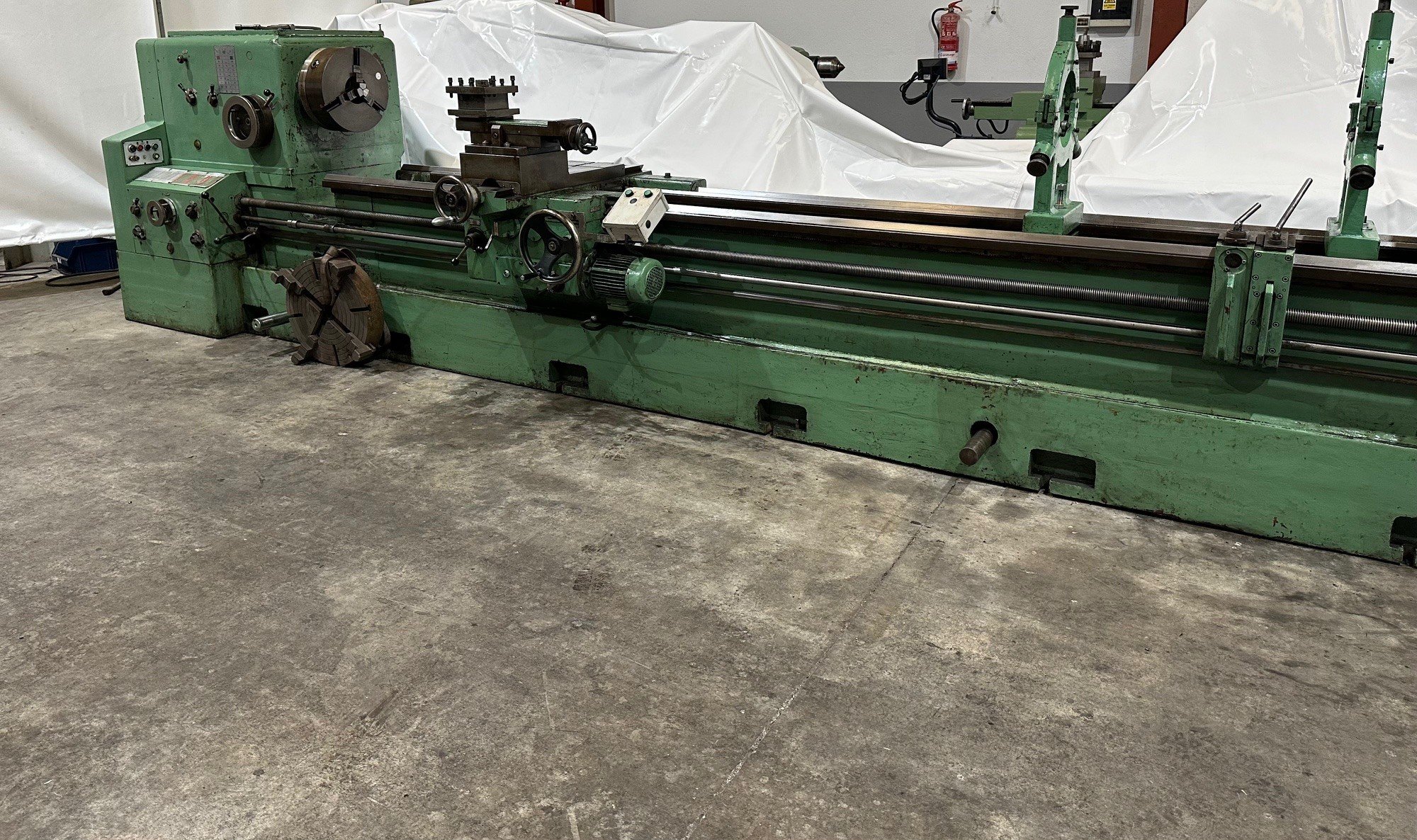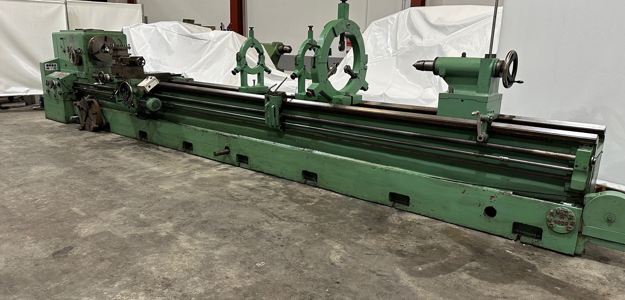 Gurutzpe Super A lathe, 6000 mm centers, 820 mm swing, powered carriage, three steadies, great for long workpieces.