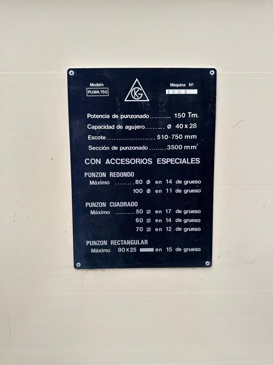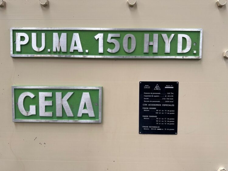 Geka Puma 150 150-ton punching machine with 750 mm throat and Ø 40 × 28 mm punching capacity. Good condition.