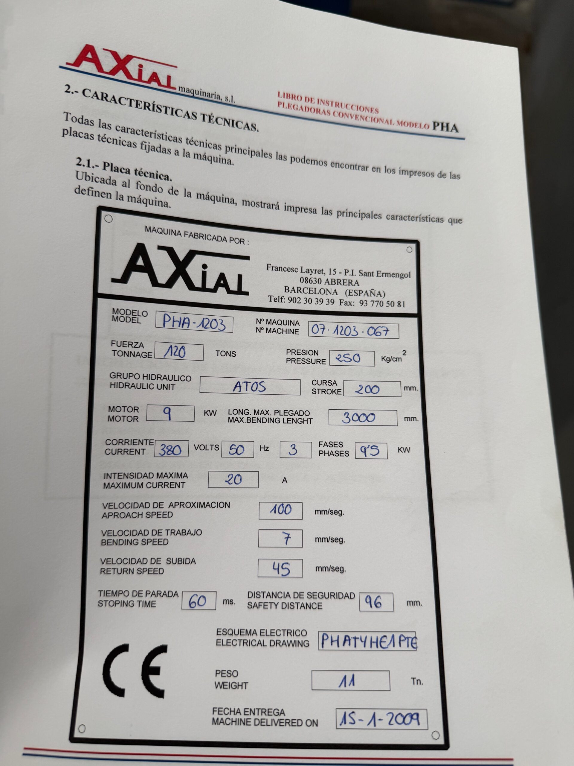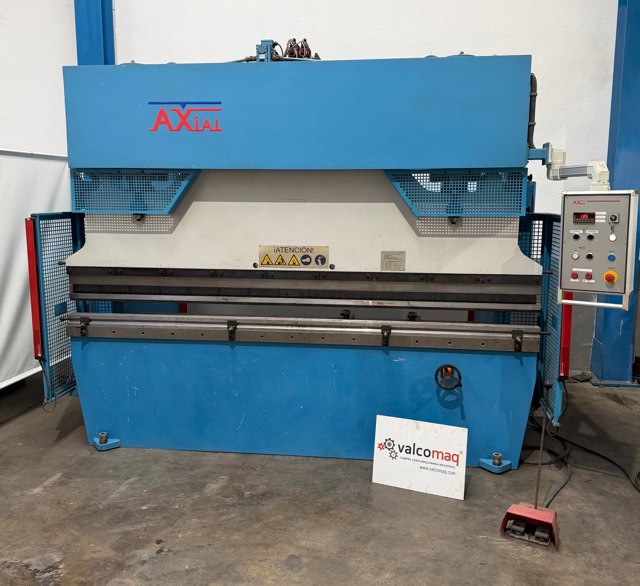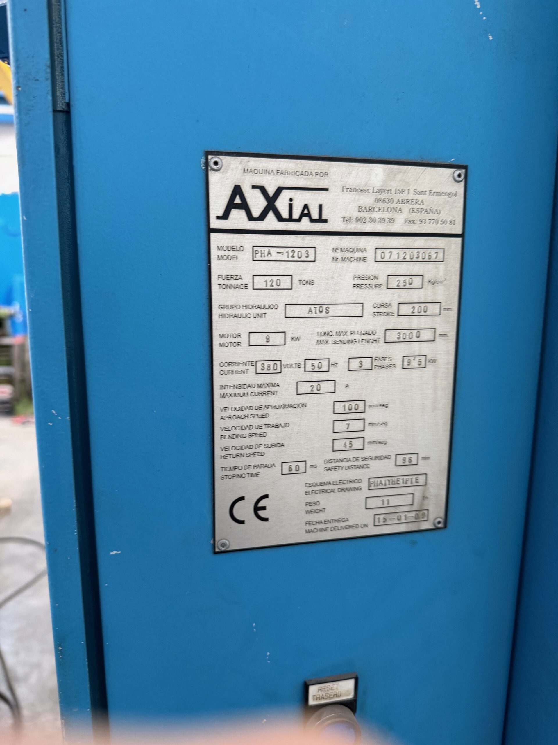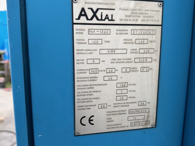 Axial PHA 1203 hydraulic press brake, 3050 mm × 120 ton, 2600 mm clearance and 12 kW motor. Good condition.