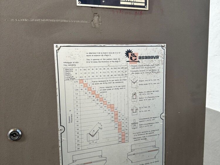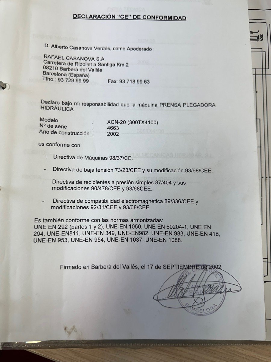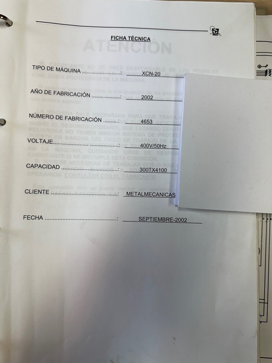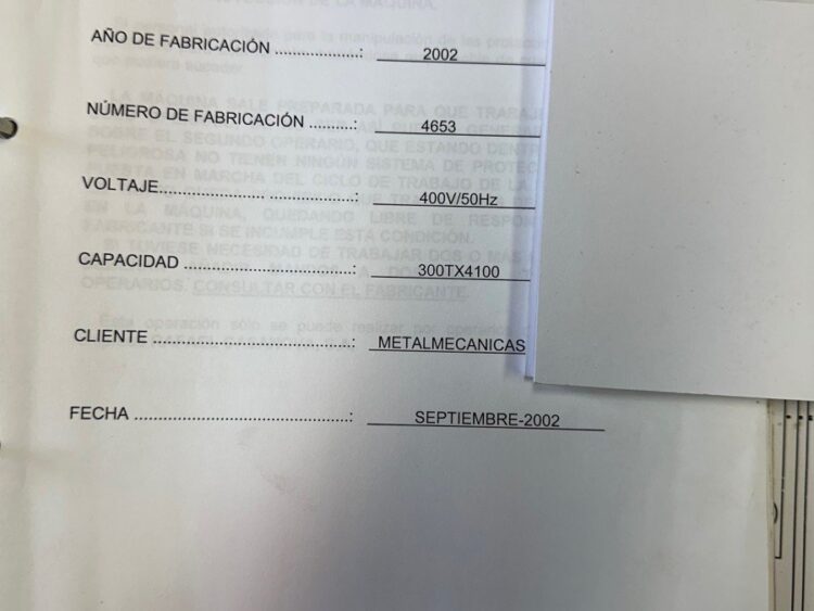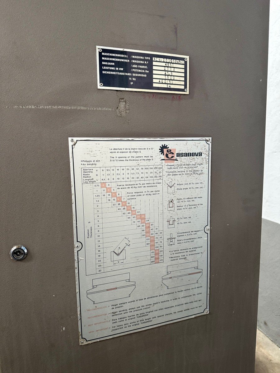 Casanova XCN 20/300 press brake, 4100 mm and 300 tons, with hydraulic crowning, 500 mm throat depth, 25 HP motor and tooling. Year 2002. Good condition.