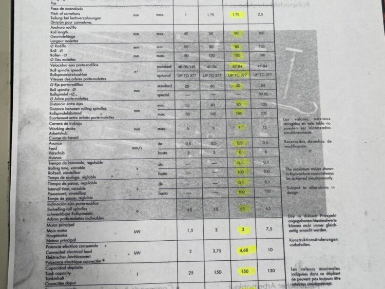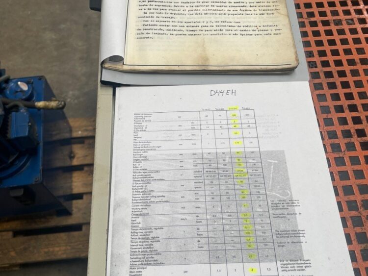 Seny D-44 EH hydraulic thread rolling machine, Ø 3–40 mm, pitch up to 3.5 mm, 4.68 kW total power and supplied with several rolls. Good condition.