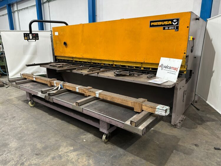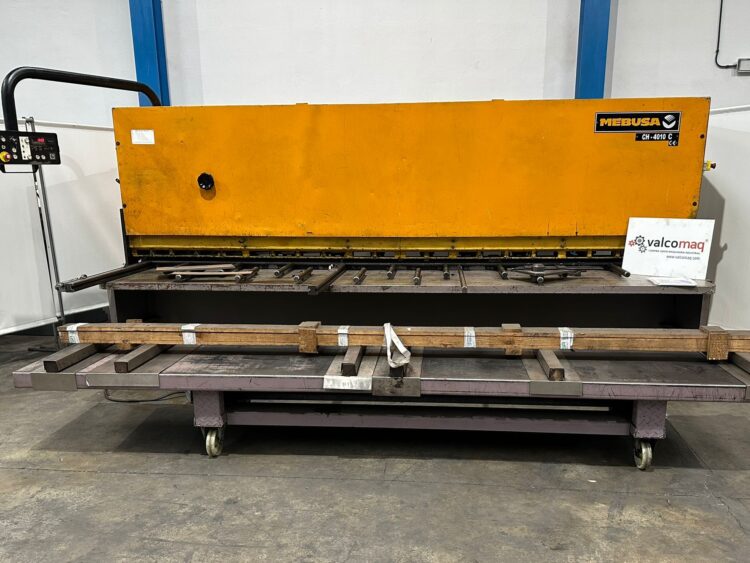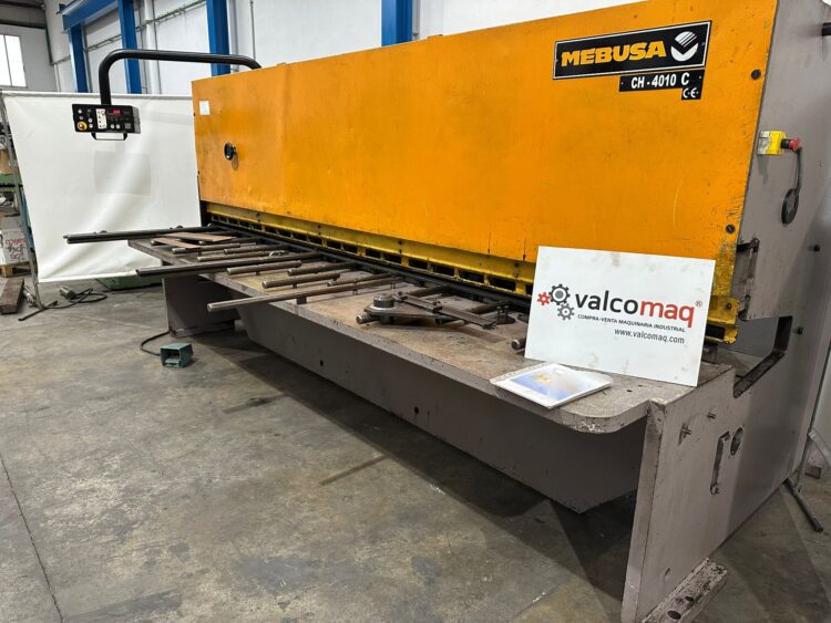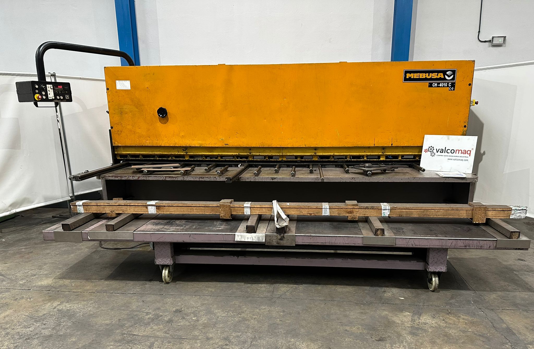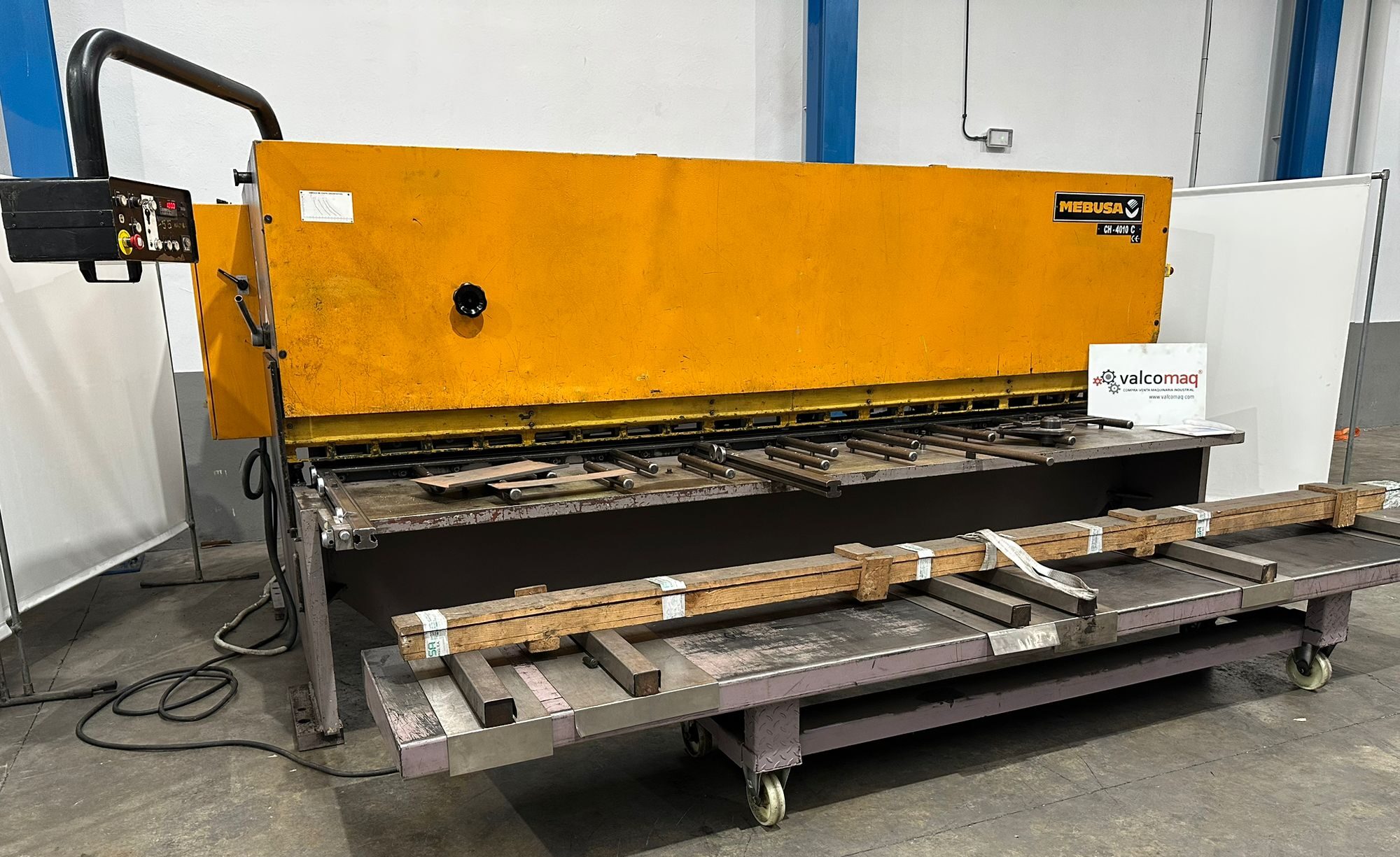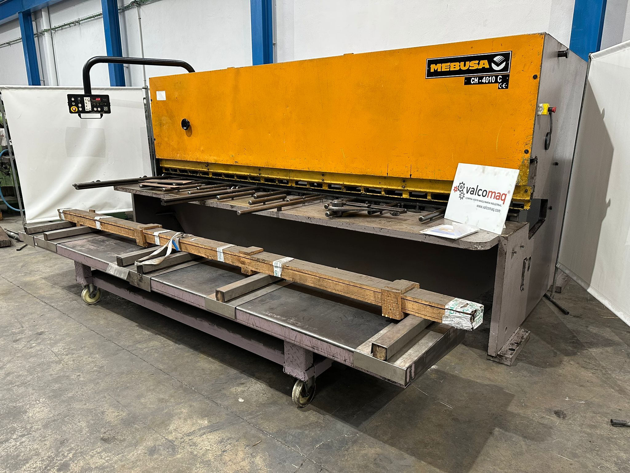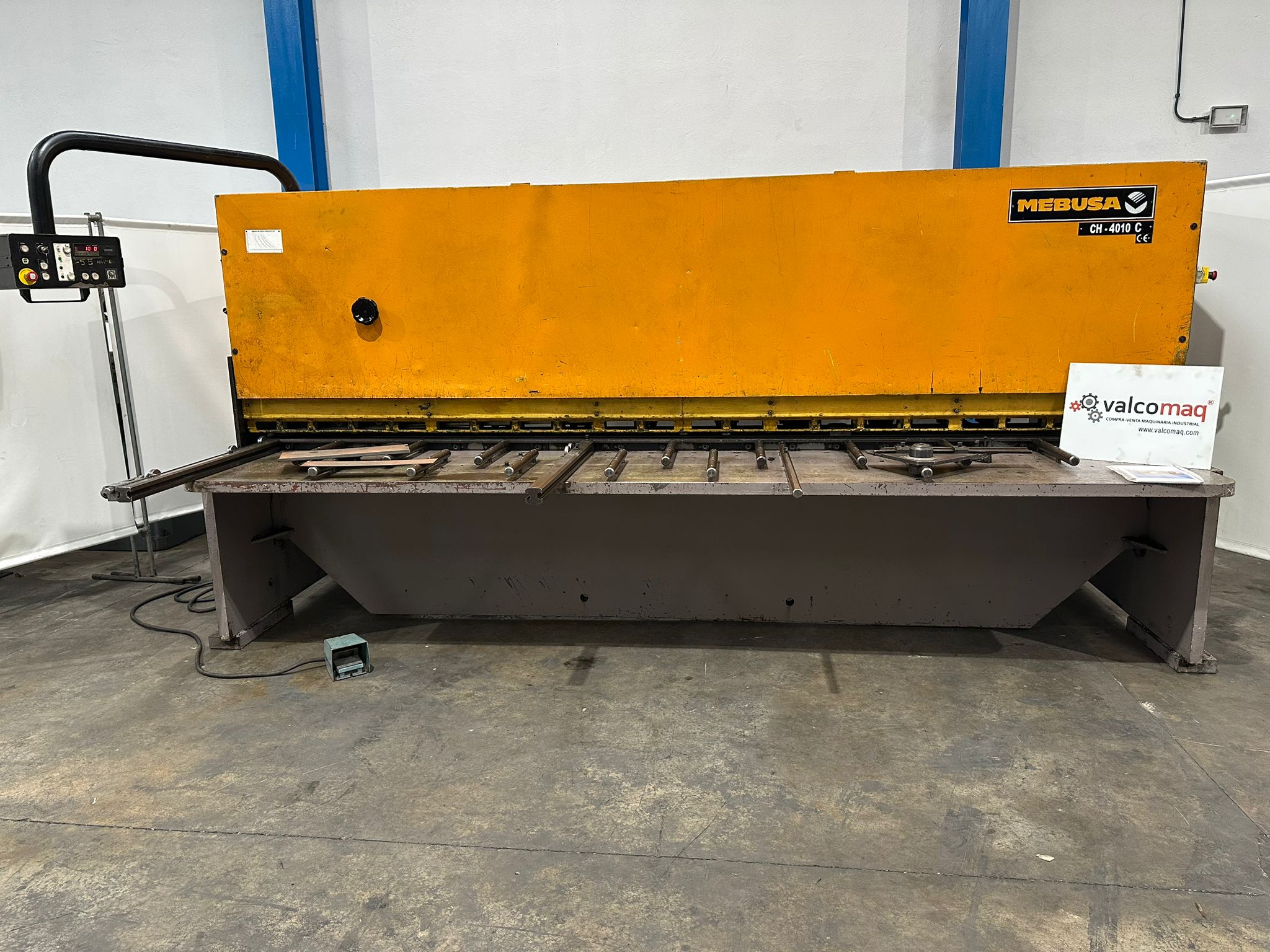 Cizalla hidráulica Mebusa CH 4010, 4050 × 10 mm, tope motorizado 1000 mm, 22 kW, 12.750 kg y CE. Muy buen estado.