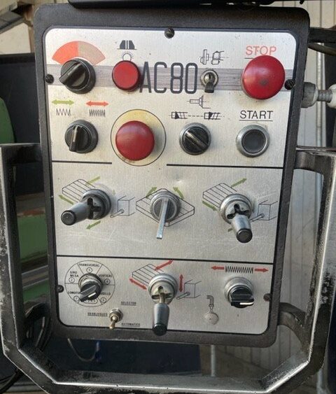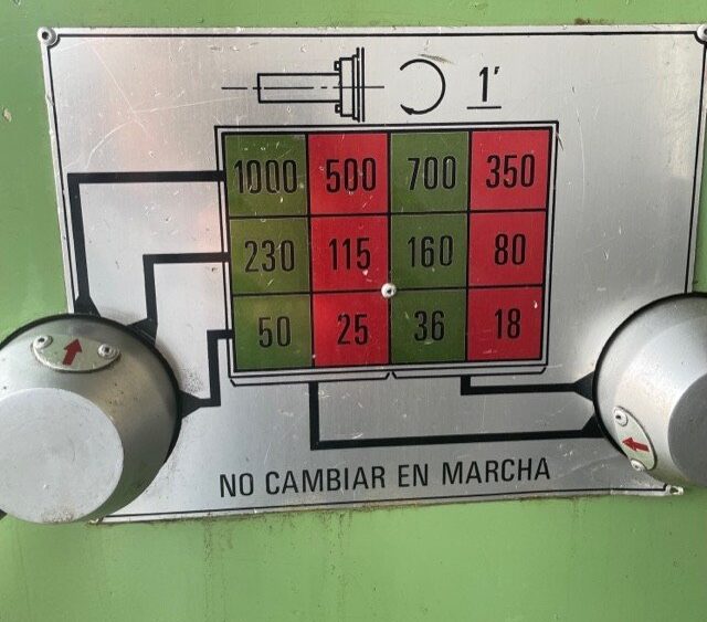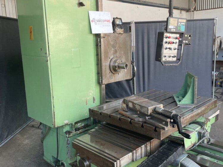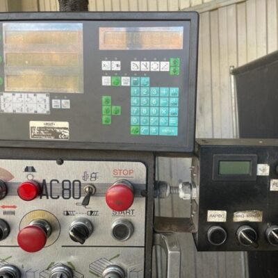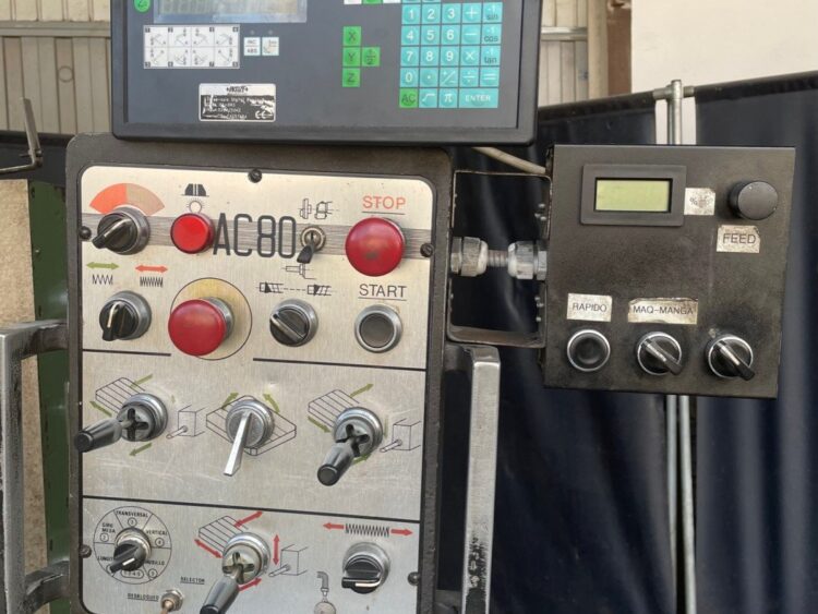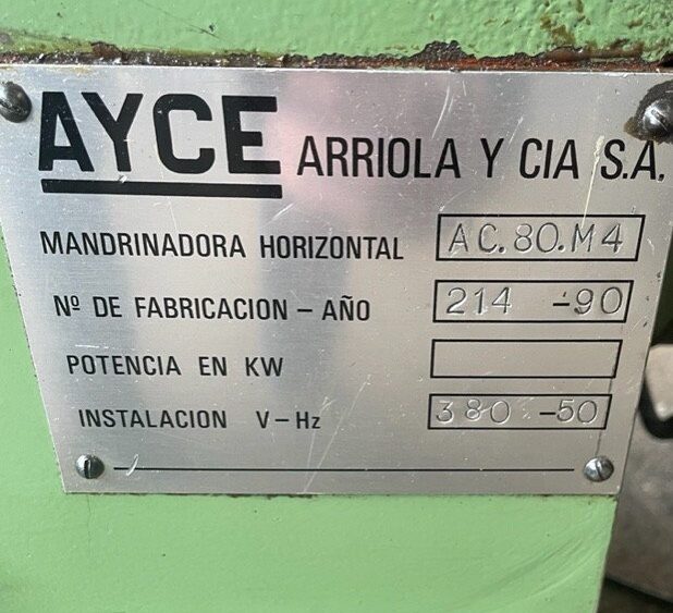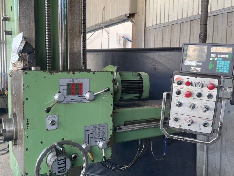 Mandrinadora AYCE AC 80 4m, caña Ø80 mm, mesa 1100×820 mm, 18 vel. 12–1000 rpm, con visualizador y amarres hidráulicos. Año 1989.