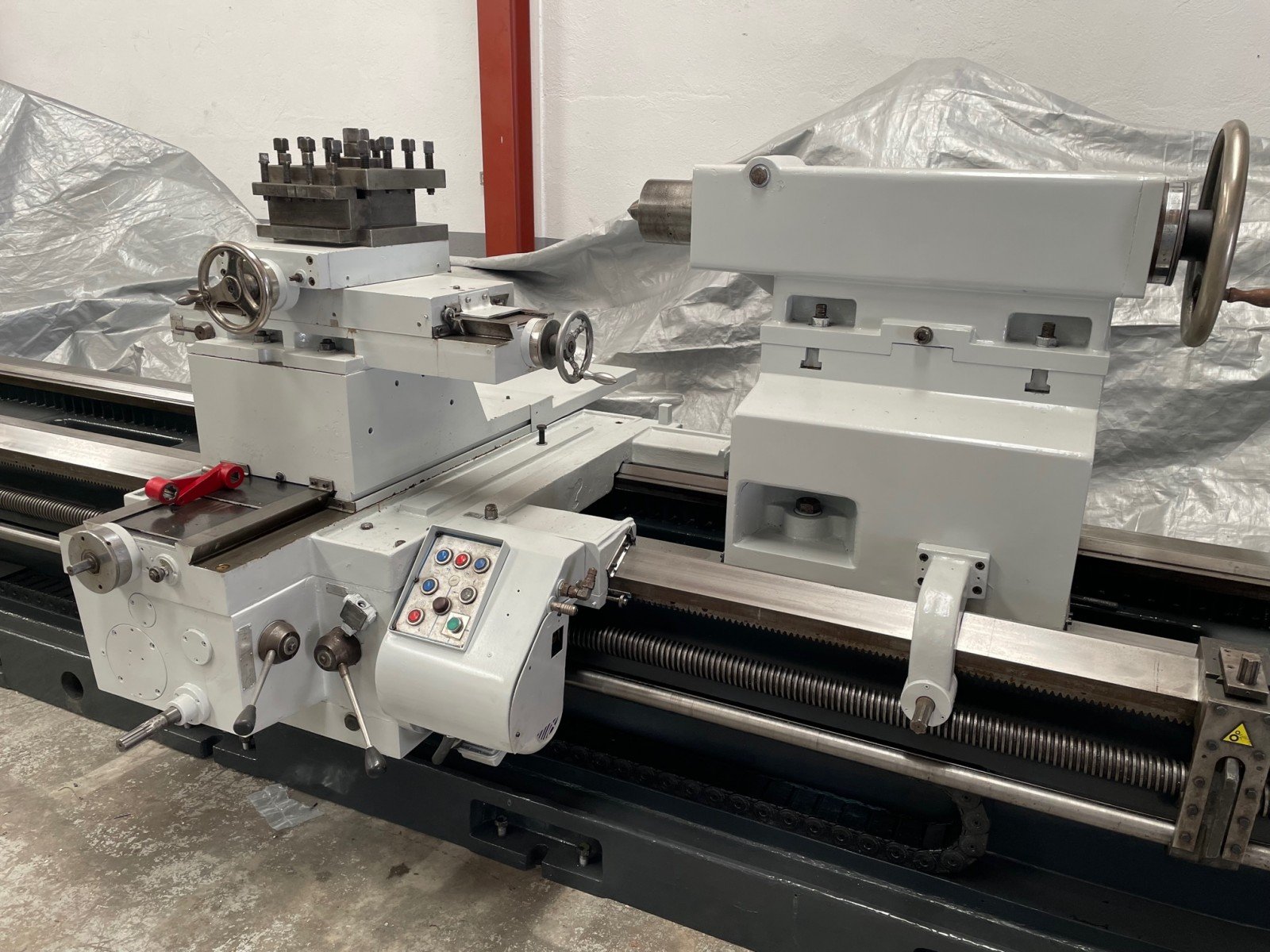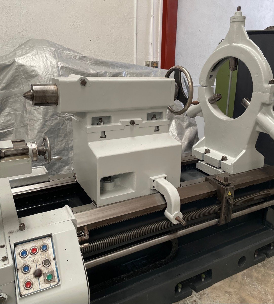 Torno Jashone M 215-E con 1600 mm entre puntos, agujero de caña de 84 mm y rango de velocidades de 50 a 1500 rpm.