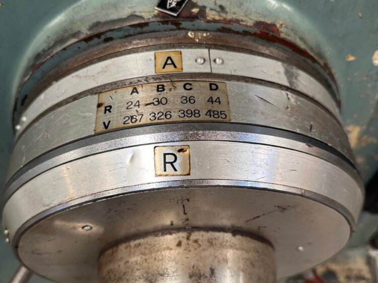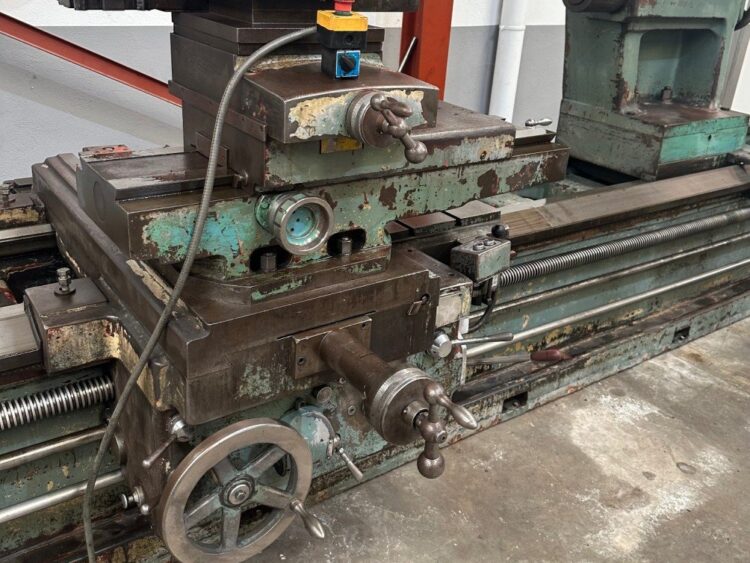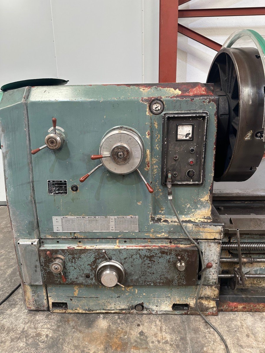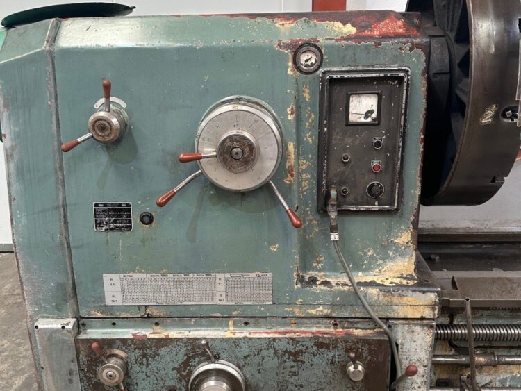Torno Jashone M 215-E con 1600 mm entre puntos, agujero de caña de 84 mm y rango de velocidades de 50 a 1500 rpm.